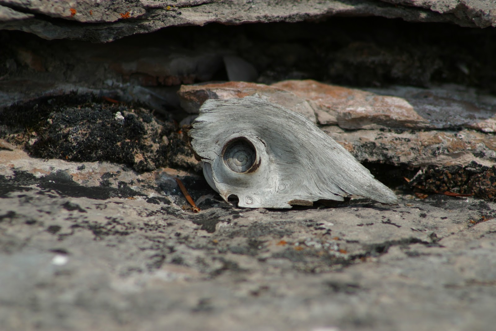 We found lots of snail shells, and live snails too, and this piece of wood seemed a fitting housing for this shell.